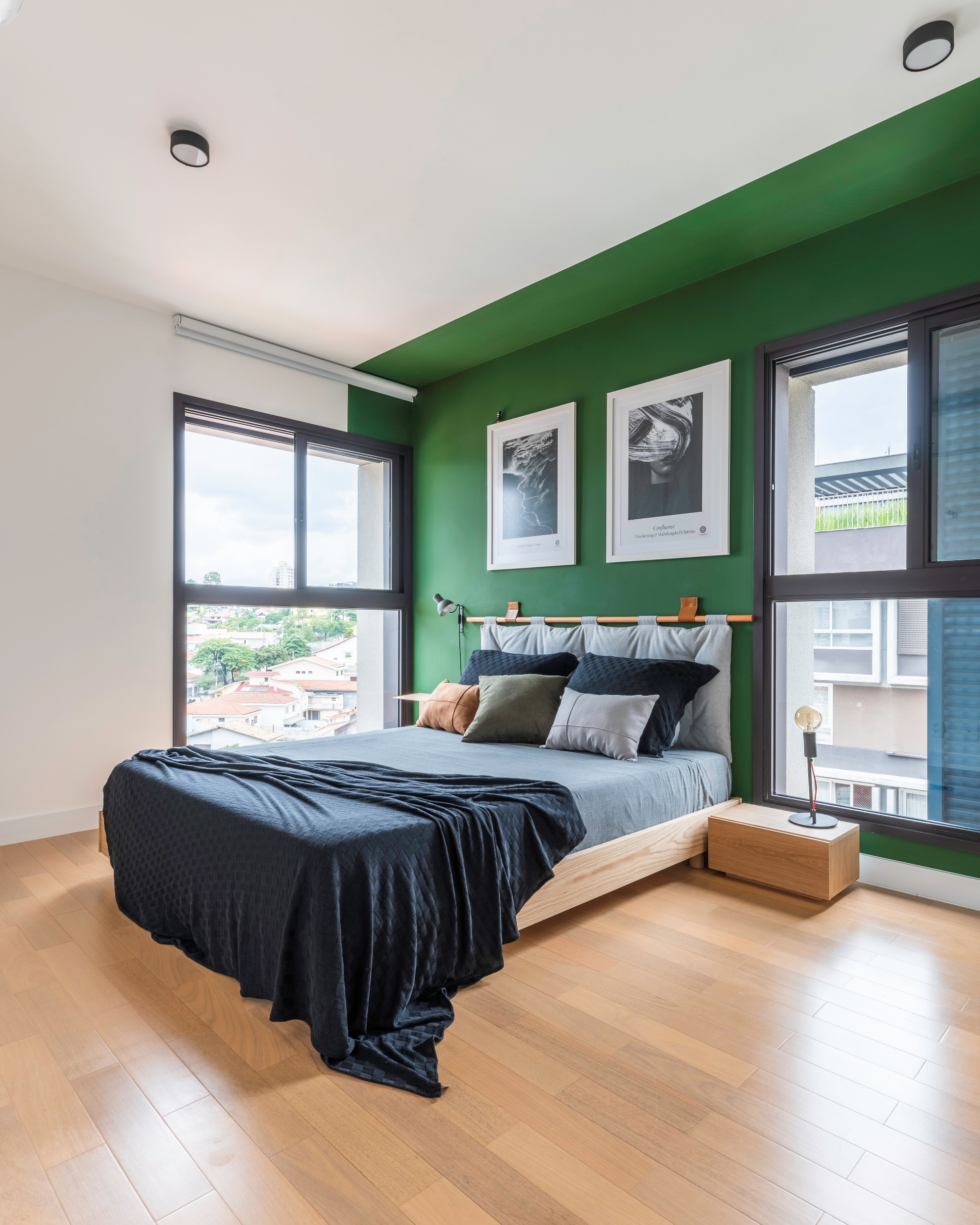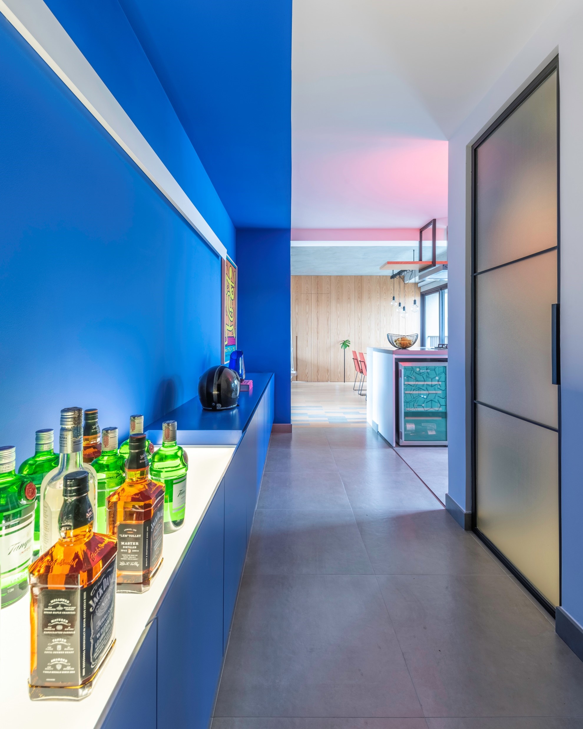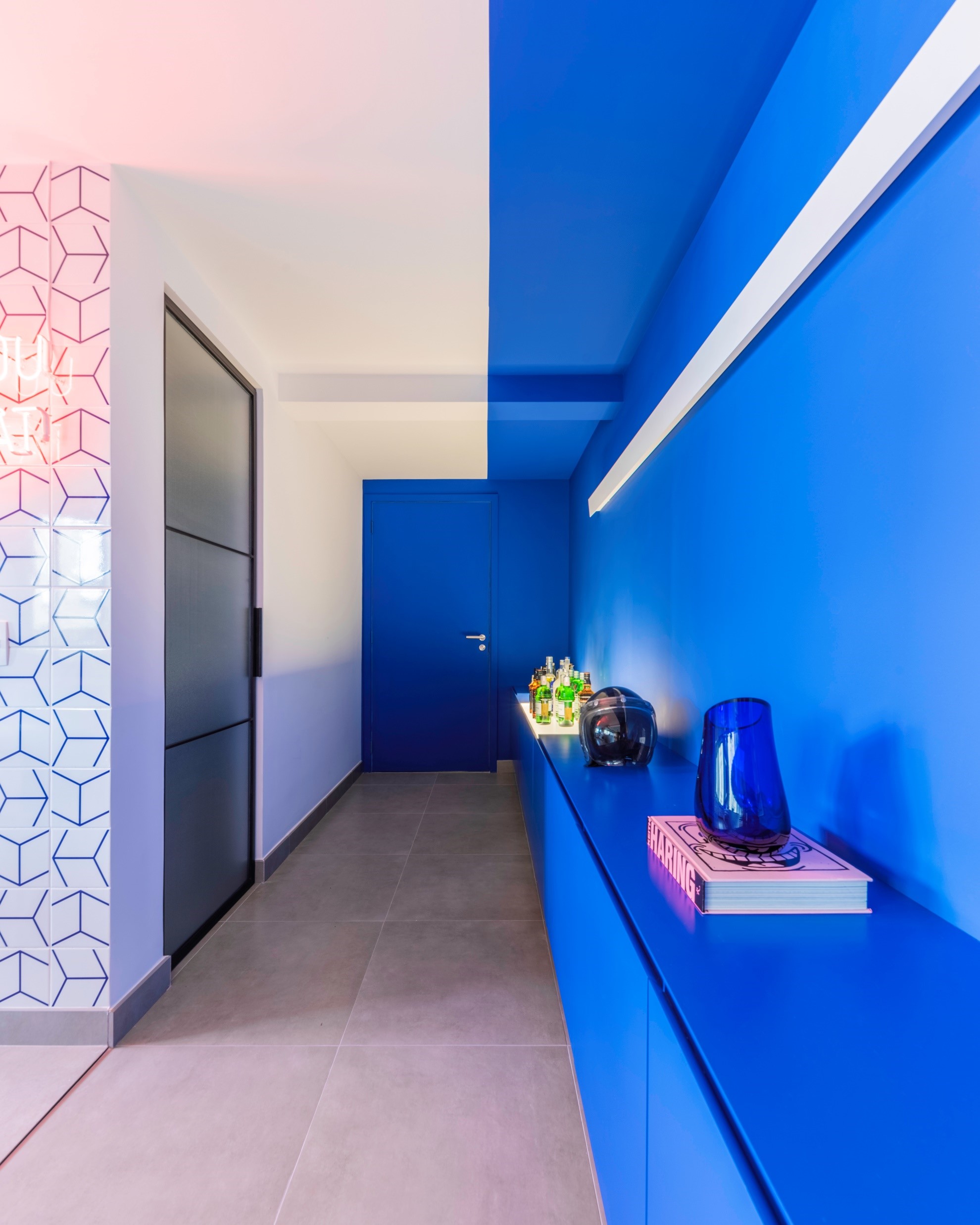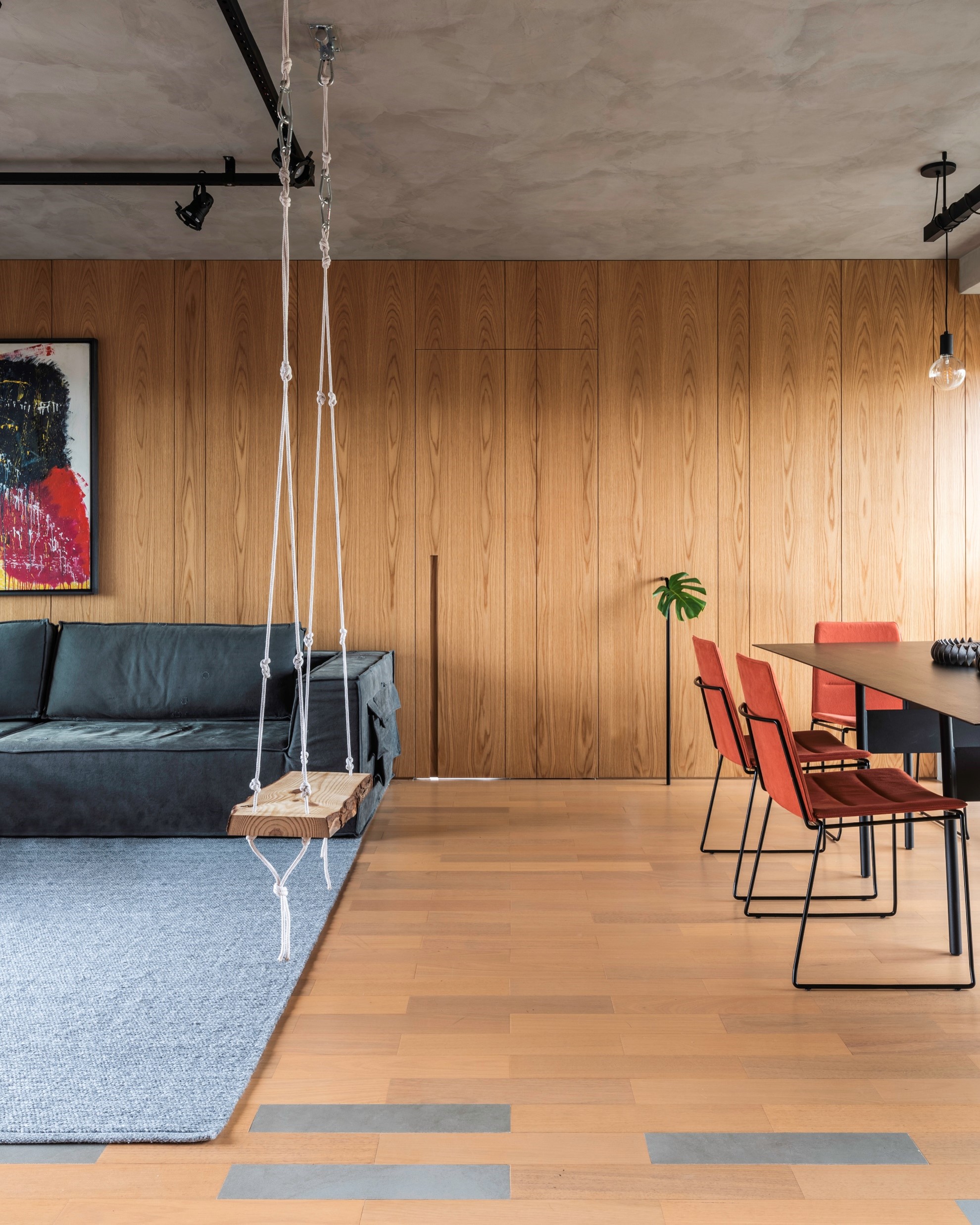Novo lavabo com porta de serralheira e vidro canelado e paredes internas revestidas de lambe-lambe. Cozinha com azulejos Mica e bancada e banco em concreto moldados in loco. Sala com painel de madeira carvalho e porta mimetizada que dá acesso aos quartos, onde o quarto principal foi ampliado dando espaço para um closet e mais armários. Toque de bom humor com o balanço no meio da sala no lugar de uma poltrona.