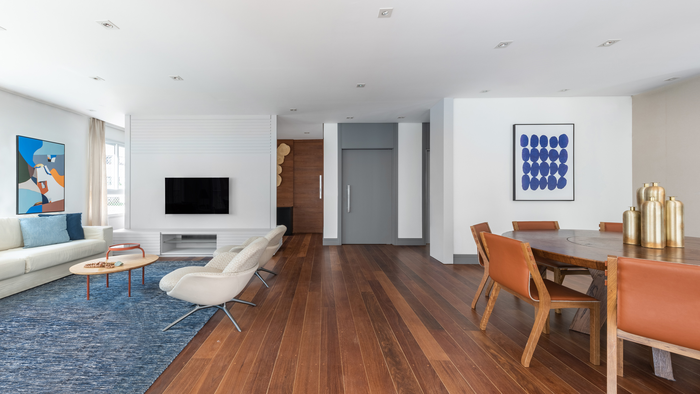 APARTAMENTO KR Novo layout e mobiliário para apartamento destinado a aluguel de alto-padrão.Sala de estar e jantar integrados em tons neutros, piso de madeira cumaru restaurada. Home Office separado por painel da TV da sala de estar.
