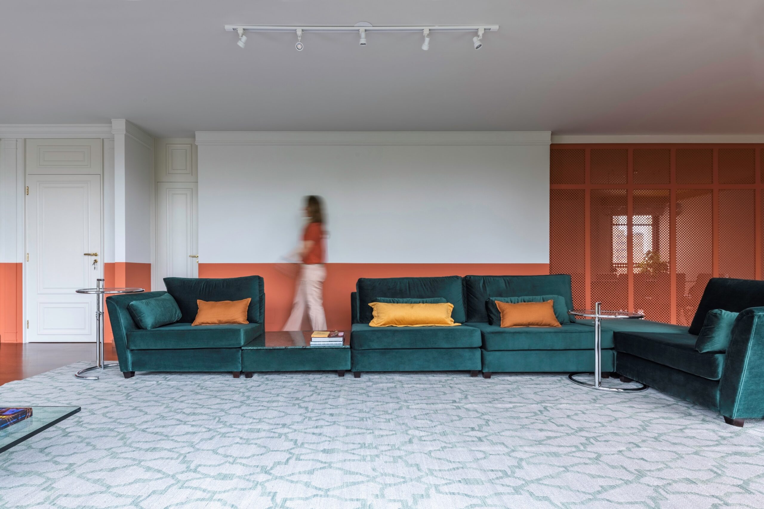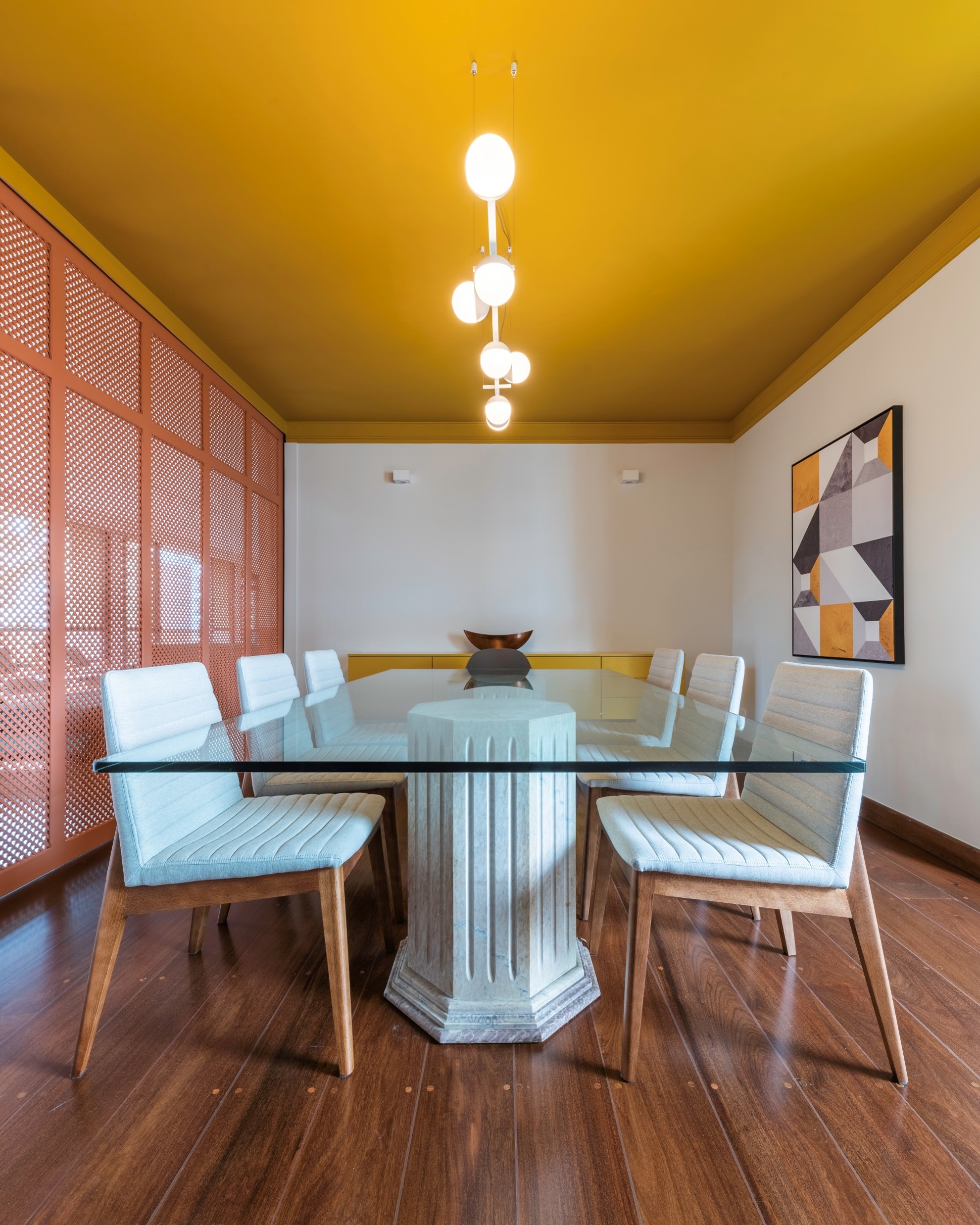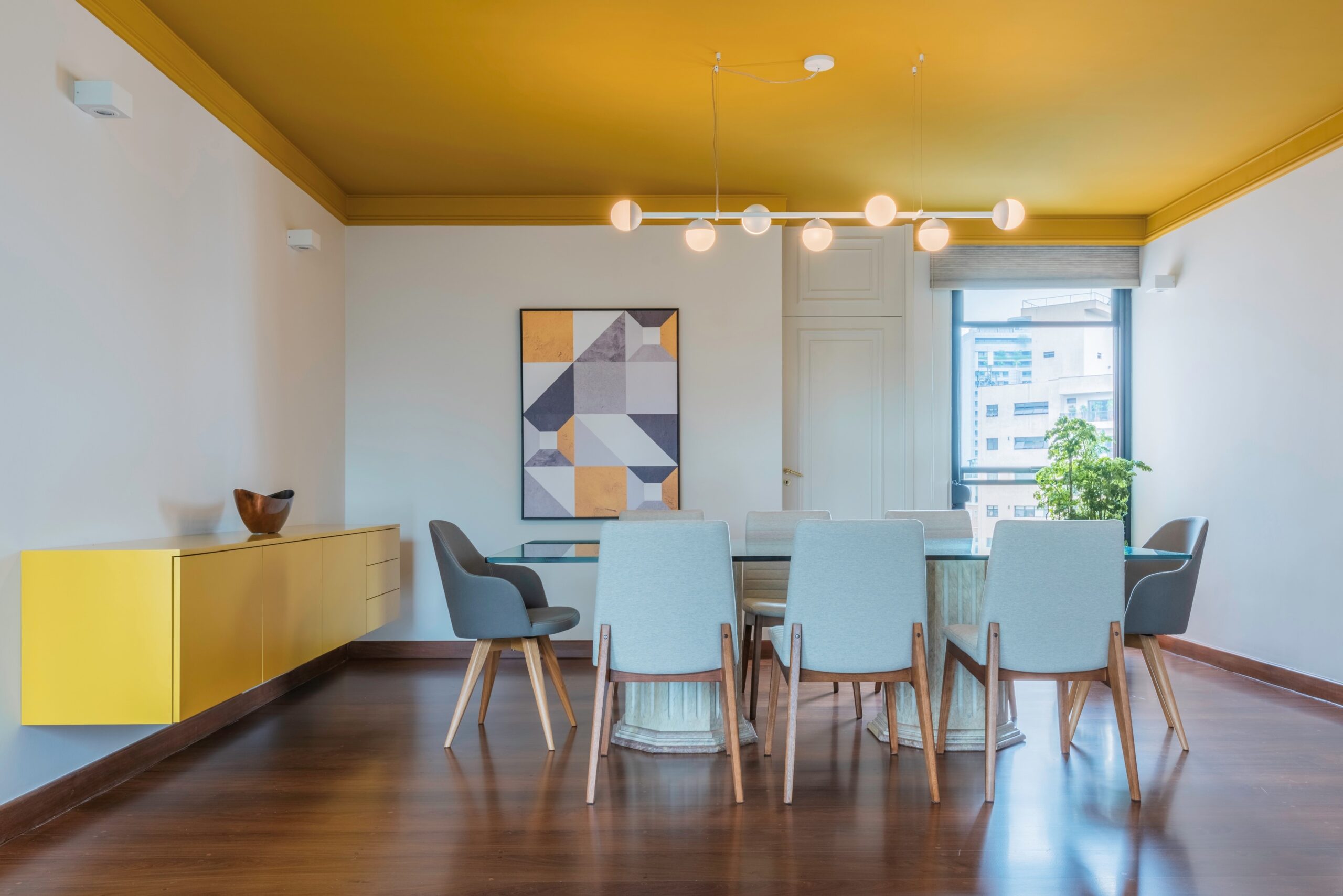 Reforma da área social do apartamento. Mantendo os móveis do cliente, os dois sofás originais foram reformados e transformados em um único elemento linear de veludo verde. Detalhe para o mármore verde aproveitado de uma antiga mesa de centro para fazer o acabamento da mesa integrada ao sofá. A Sala de jantar com teto amarelo manteve a mesa original com pés de pedra integrado a novos elementos de linhas mais contemporâneas. O bar desenhado para marcenaria com iluminação no tampo é um detalhe especial e a mesa Talinda com o tampo de vidro aproveitado de outra mesa da cliente.