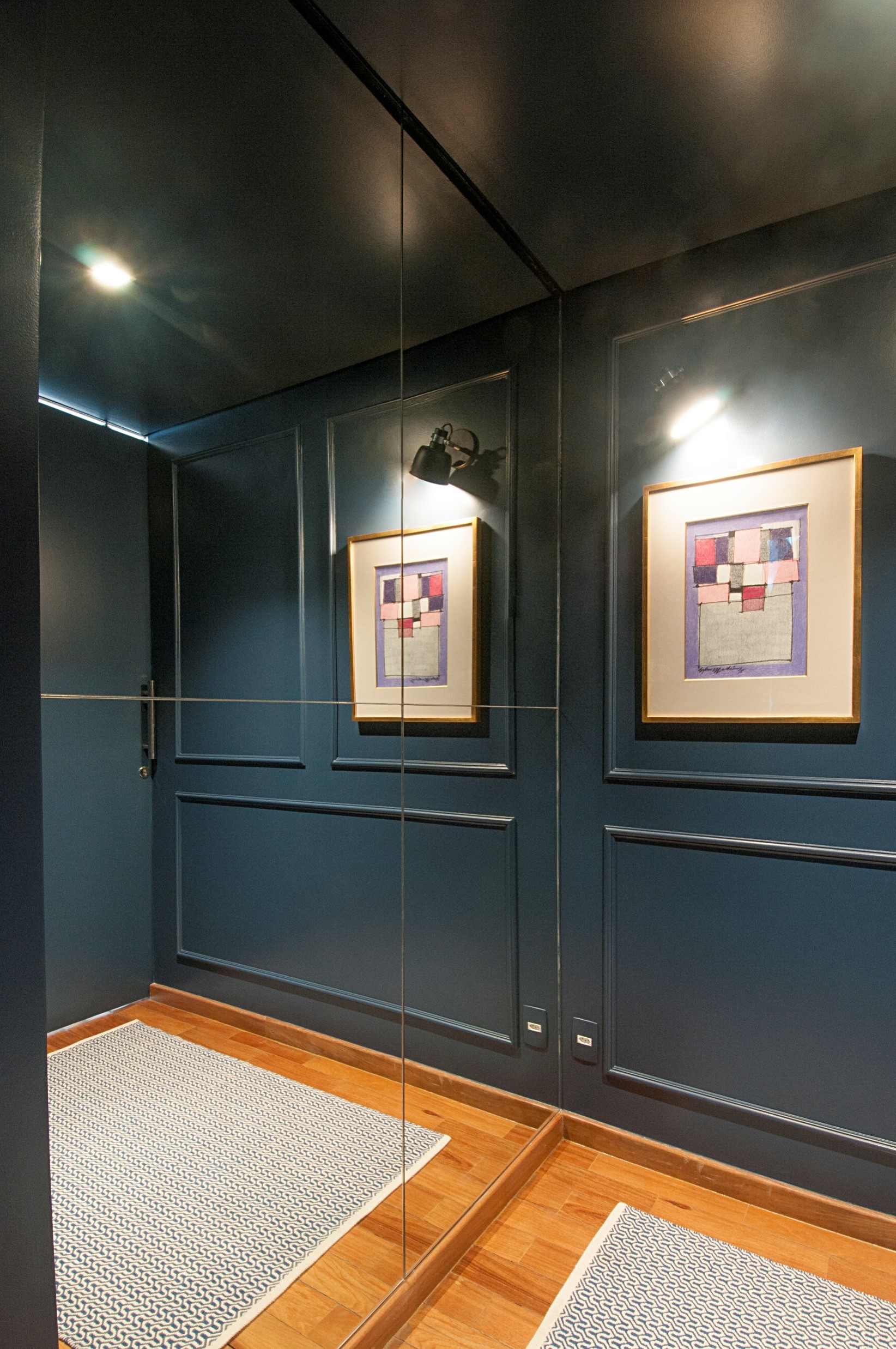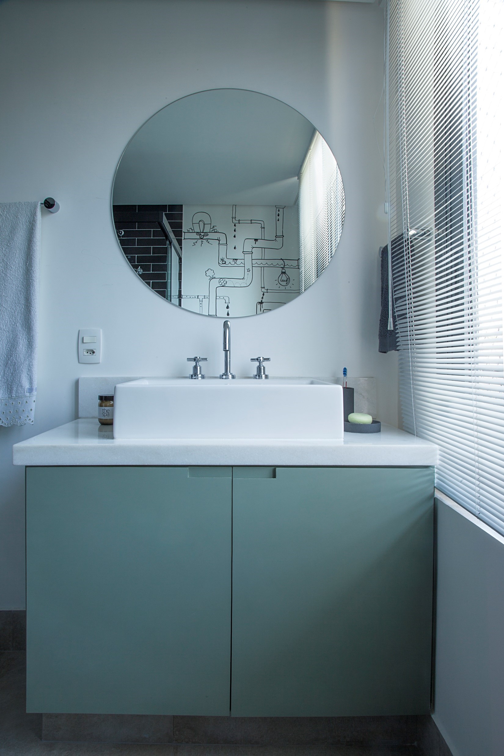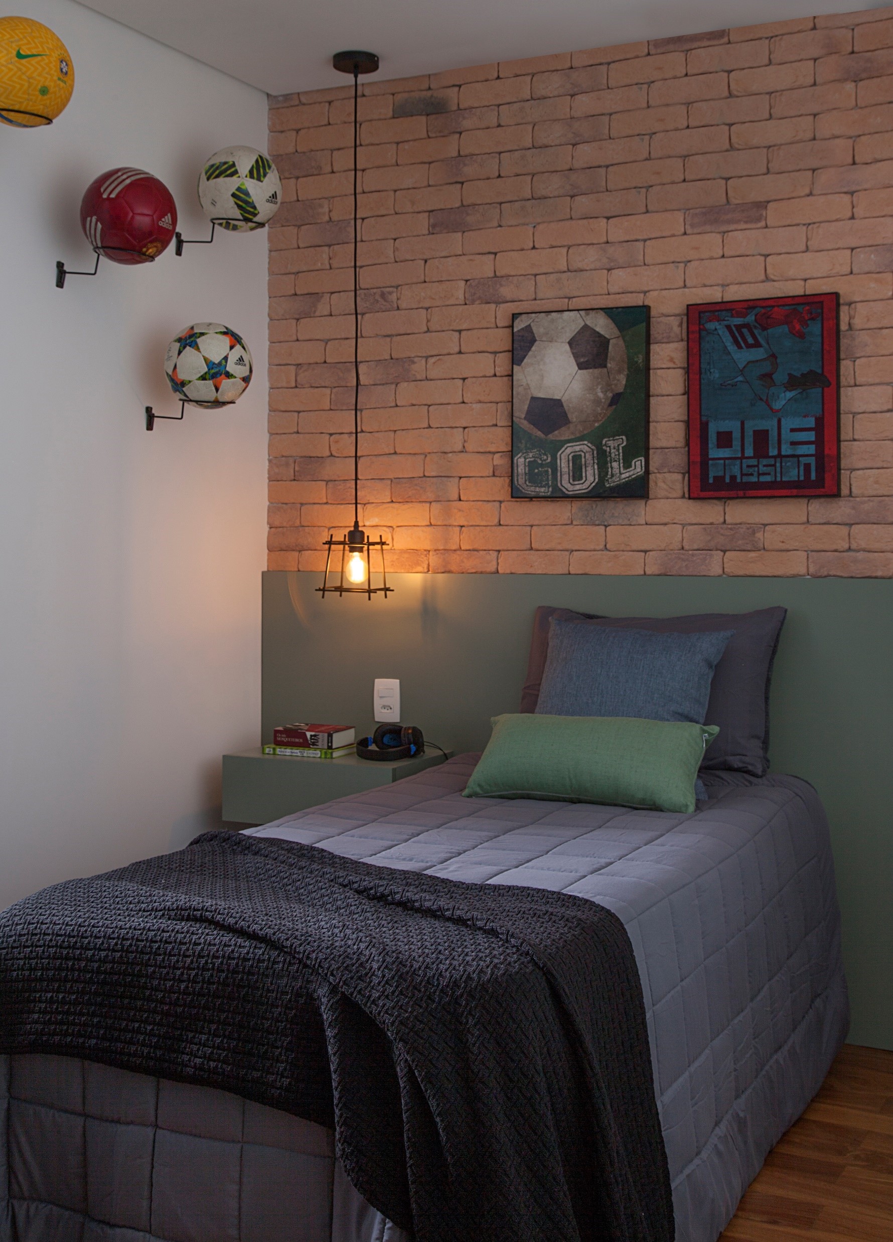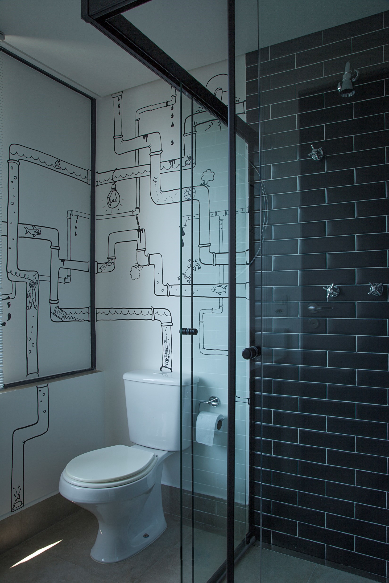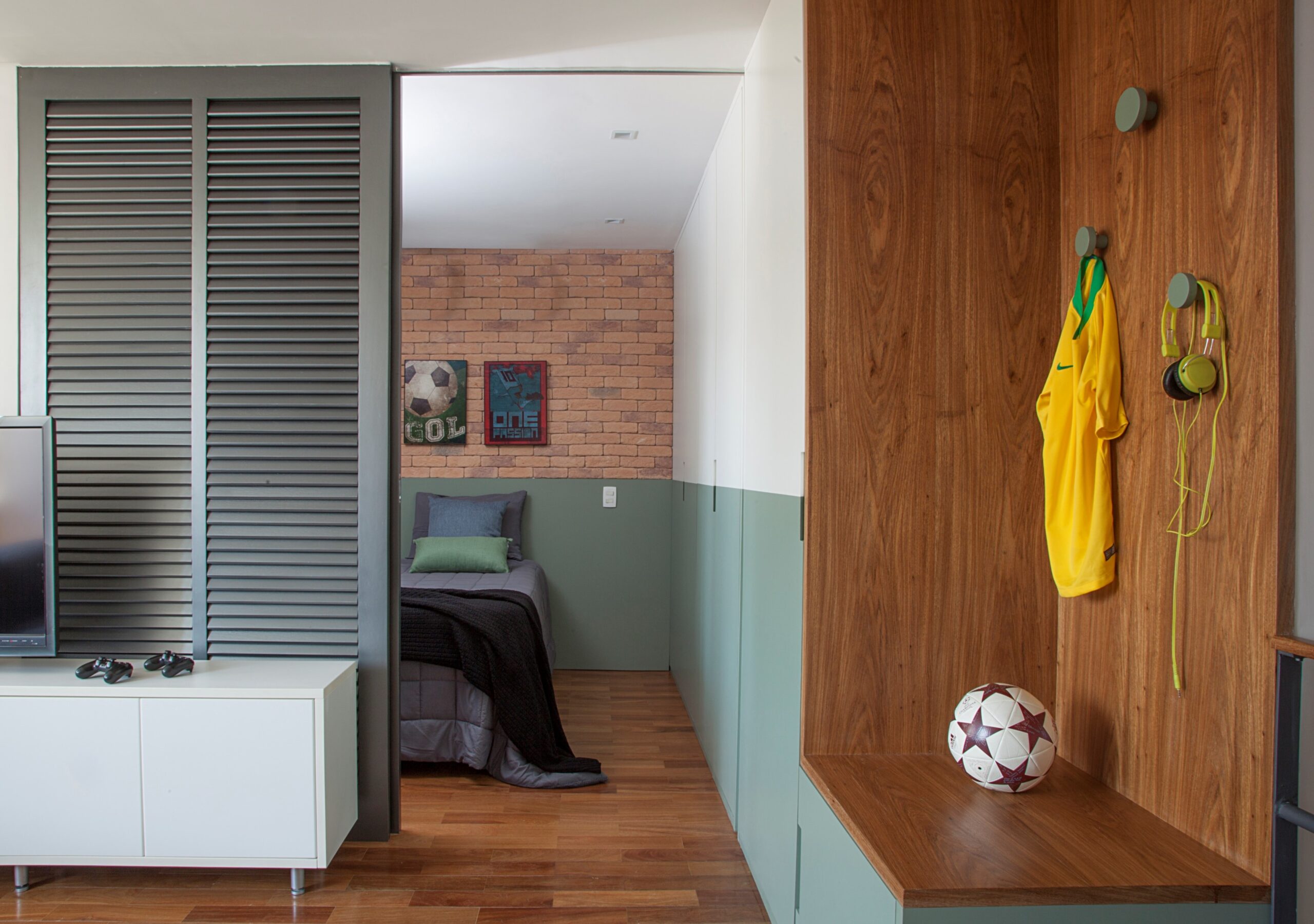 Reforma de sala para acomodar sala de TV, quarto para menino adolescente e banheiro. Portas de correr com veneziana basculante separando a sala do quarto. Grafite no banheiro feito pela Arquiteta Luciana Uras.